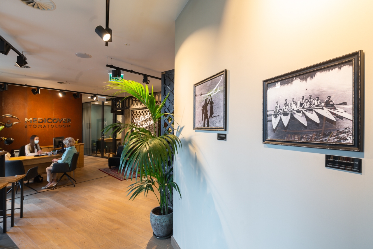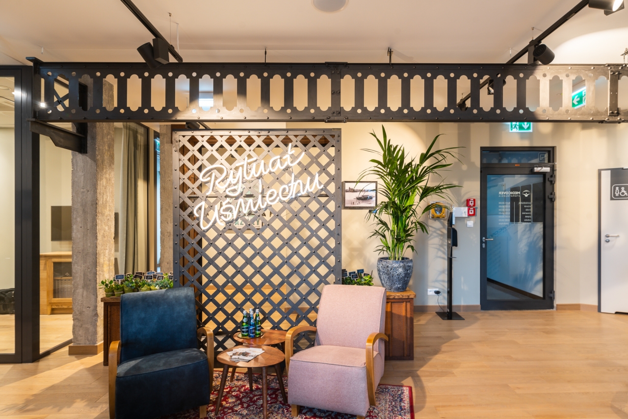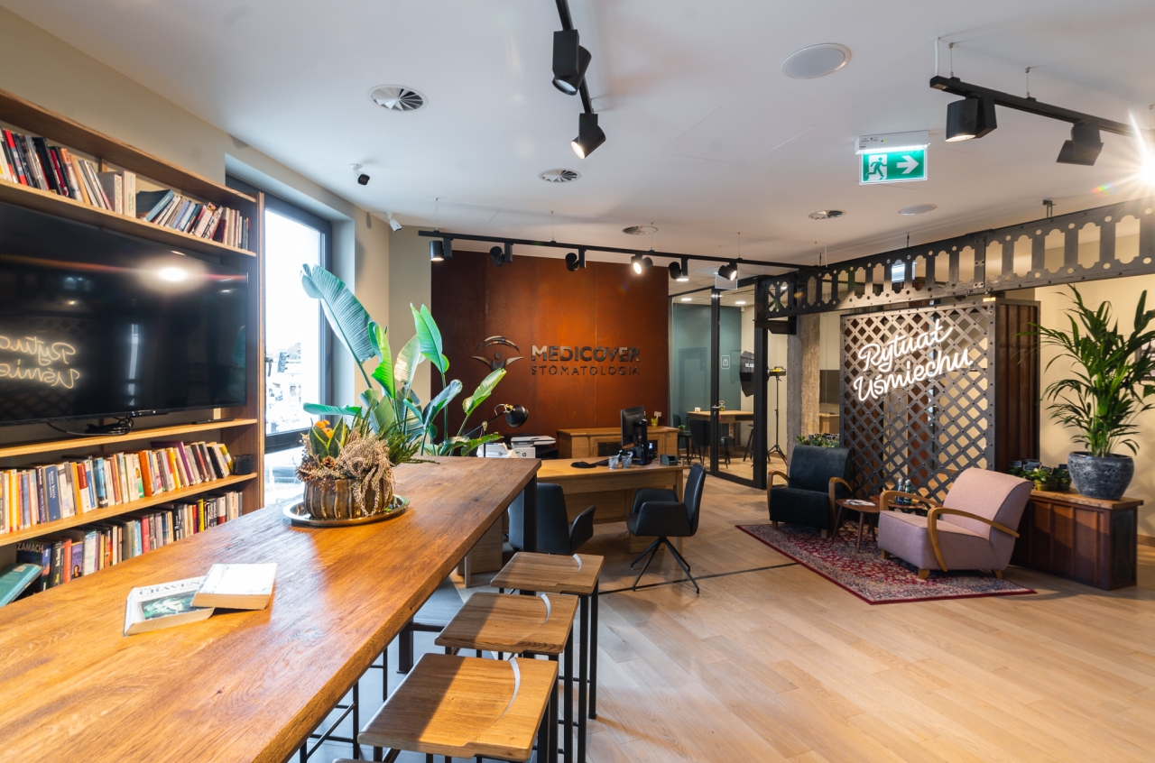 To dlatego we wnętrzu toruńskiego centrum zamiast krzeseł w poczekalni ustawiono wygodne fotele i stoliki kawowe, a zamiast plansz z anatomią zęba na ścianie – biblioteczkę z kilkuset pozycjami. W poczekalni można znaleźć także wspólny stół, miejsce typowe dla kawiarni. Nie brakuje także nawiązań do toruńskiej architektury. Zardzewiałe, żelazne blachy czy nitowe stalowe kształtowniki, pojawiające się w dekoracji wnętrza, miały swoją inspirację w stalowych mostach łączących brzegi Wisły.