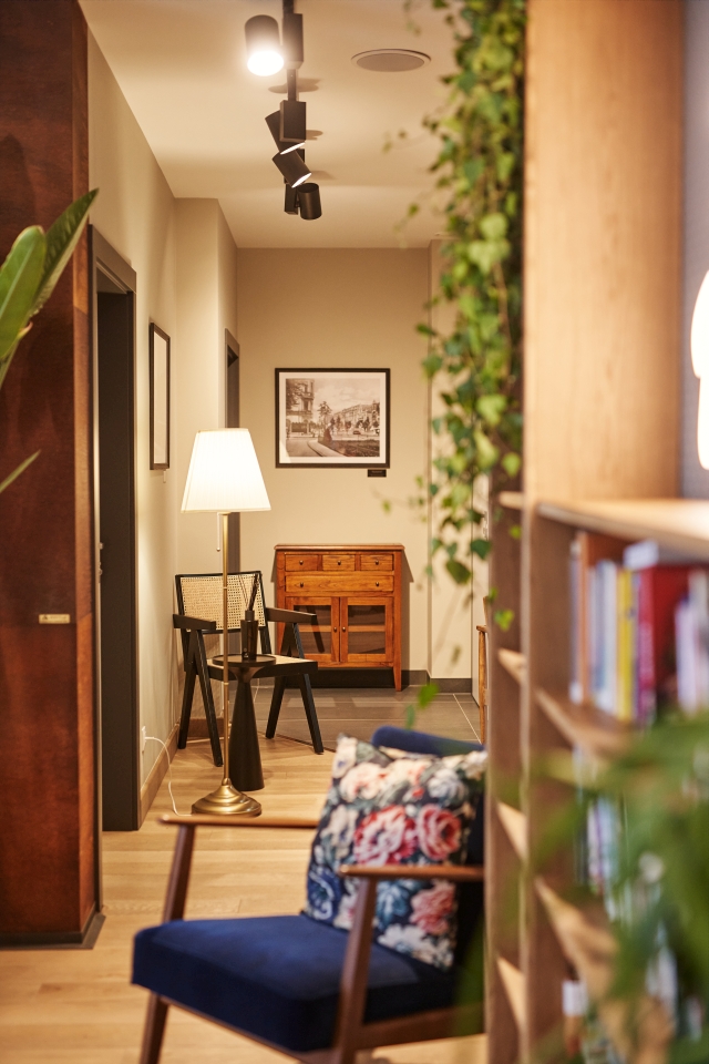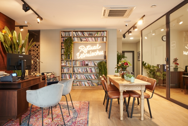 Pacjenci mogą na niej znaleźć nawet kilkaset pozycji, w tym kultowe powieści, poezję i albumy ze zdjęciami. Z kolei osoby, które nie lubią czekać na swoją kolej w fotelu, mogą to zrobić przy znanym z kawiarni common table, czyli dużym stole z krzesłami, tu ustawionym w centralnym punkcie poczekalni. Do dyspozycji pacjentów jest także kącik kawowy, w którym samodzielnie można zaparzyć sobie kawę lub herbatę.