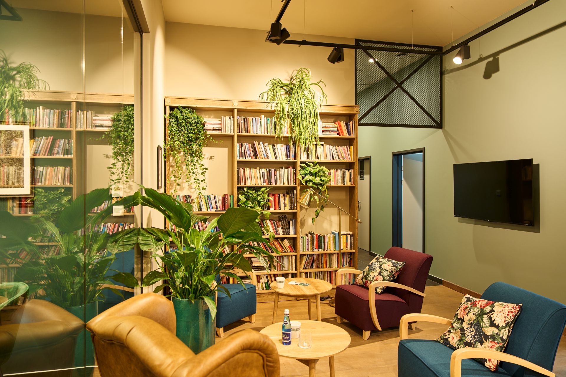 I tak w całej przestrzeni można znaleźć ogrom kawiarnianych inspiracji. Na przykład do poczekalni wstawiono wygodne fotele nawiązujące do kultowych wzorów vintage, a także biblioteczkę z setkami książek, które odzyskane zostały m.in. z likwidowanych zbiorów bibliotecznych. Ten element, w zamyśle twórców, ma umilić czas oczekiwania na wizytę.