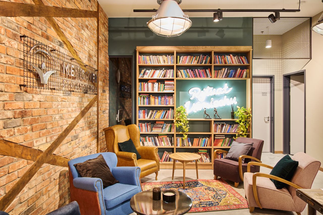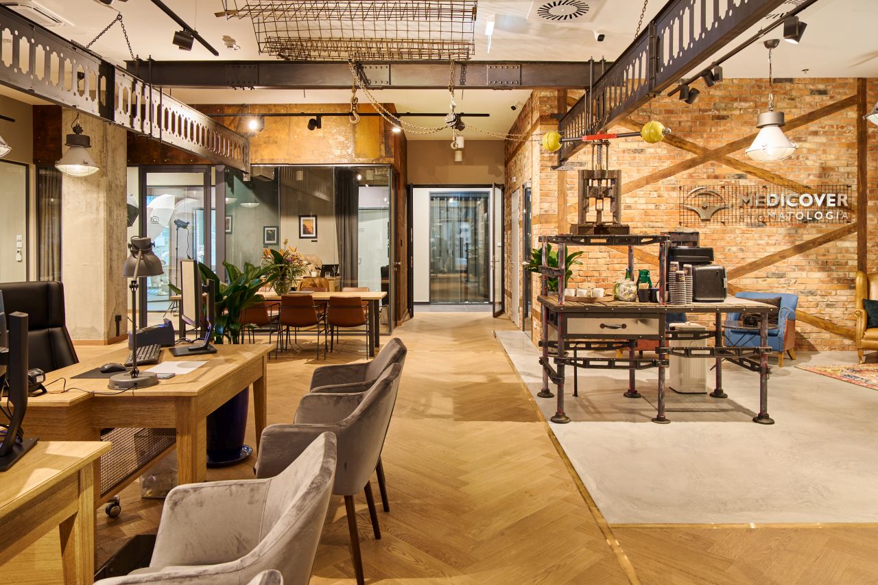 Podkreślają je m.in. liczne poprzemysłowe zapożyczenia, jakie zastosowano w wykończeniu wnętrz. Przykładem jest rdzewiona blacha w tle poczekalni czy metalowe elementy dekoracyjne. O tym, że inspiracji szukano w kawiarniach przypomina natomiast aranżacja poczekalni, która wypełniają fotele w stylu vintage, stoliki kawowe, biblioteczka z książkami z odzysku czy stoisko kawowe zaaranżowane na starej poprzemysłowej prasie.