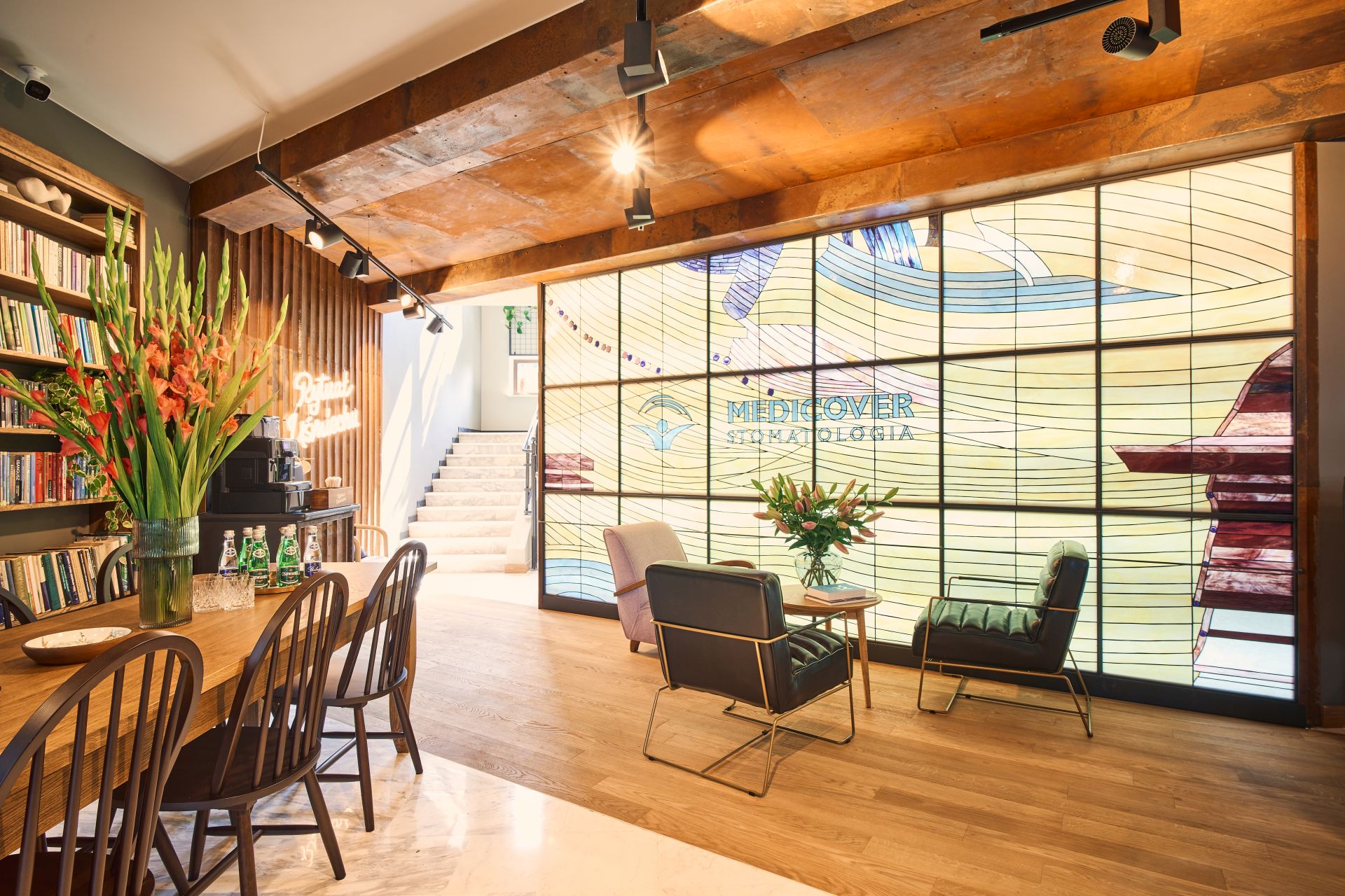 Efekt? Na powierzchni 410 m kw. stworzono centrum stomatologiczne, czerpiące garściami ze stylu art déco, który dobrze przyjął się w międzywojennej Warszawie. Ten akcent w nowej lokalizacji Medicover można dostrzec zwłaszcza w klubowych fotelach z giętego drewna, które zastąpiły poczekalniane krzesła, ale także w wykonanym tradycyjną metodą witrażu, który został wstawiony w lobby.