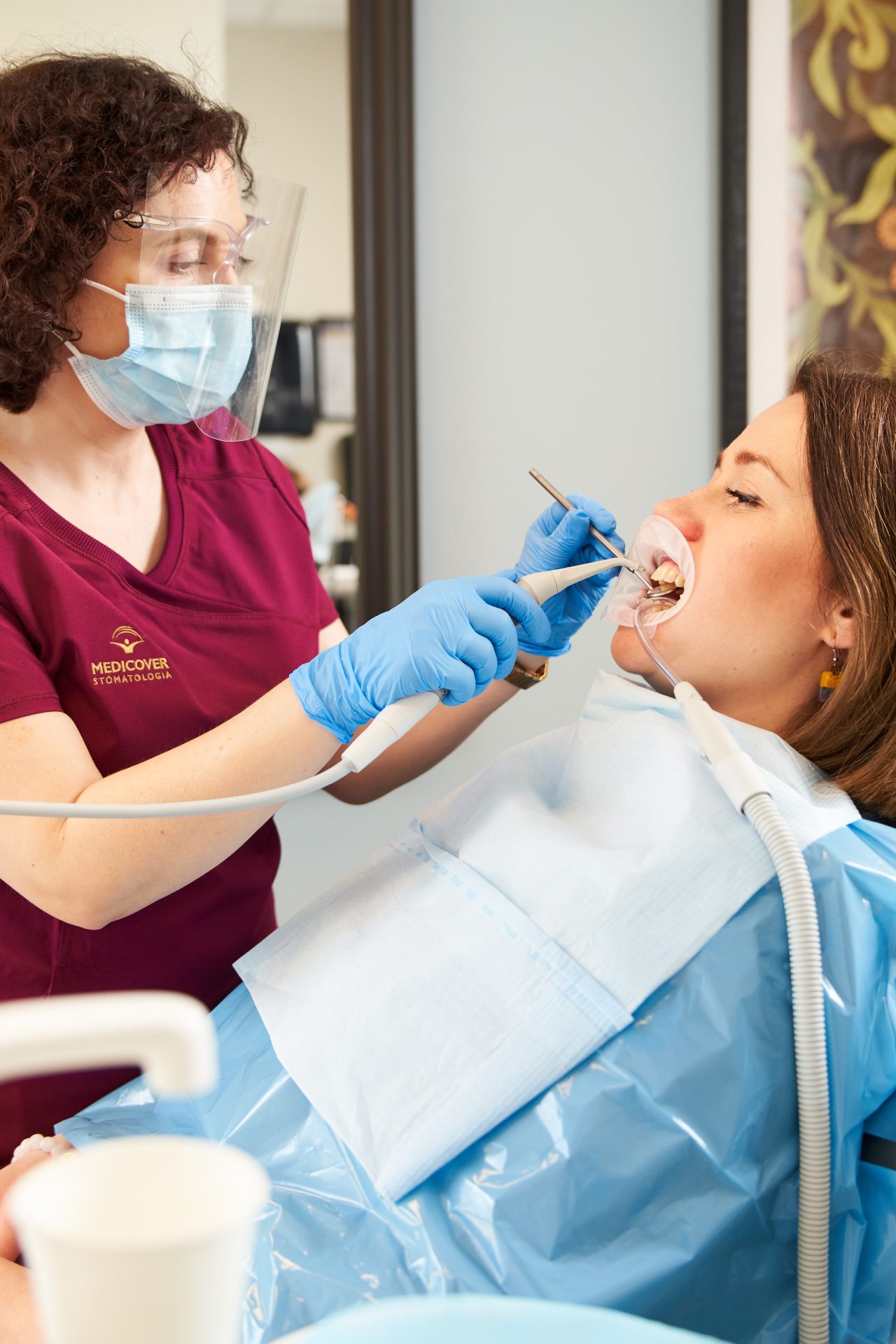 – Kolejny krok to już właściwe zabiegi, tu w formie tzw. Airflow, czyli z wykorzystaniem bardzo drobnego 14-mikronowego piasku, który usuwa biofilm naddziąsłowy i poddziąsłowy do 4 mm głębokości, a także przebarwienia oraz wierzchnią warstwę zmineralizowanej płytki. Uwzględniamy nawet język czy podniebienie. Krok dalej to „Perioflow”, czyli głębokie oczyszczanie kieszonek do 9 mm. Na tym jednak nie koniec: zostało nam usuwanie stwardniałego kamienia precyzyjną końcówką ultradźwiękową – wyjaśnia szczegóły higienistka Ewa Buczkowska.
