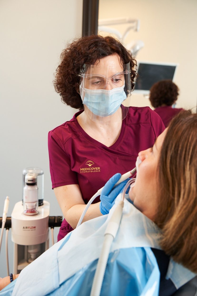 Następnie przechodzi się do wybarwiania osadów, by pokazać pacjentowi, co powinien poprawić. Zebrane wnioski higienistka omawia, proponuje zmianę techniki, dobór szczoteczki czy dodatkowych przyborów, jak irygator.