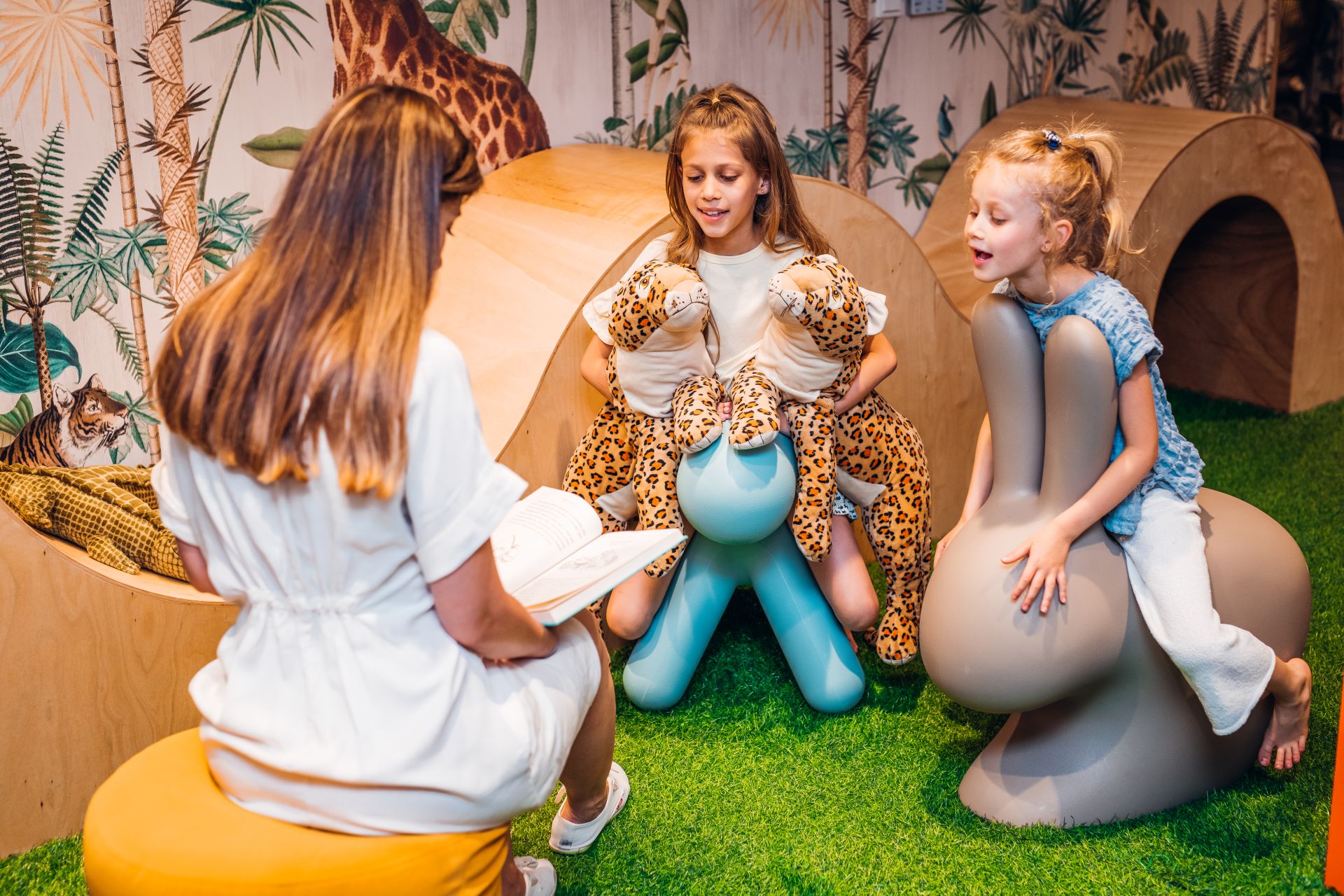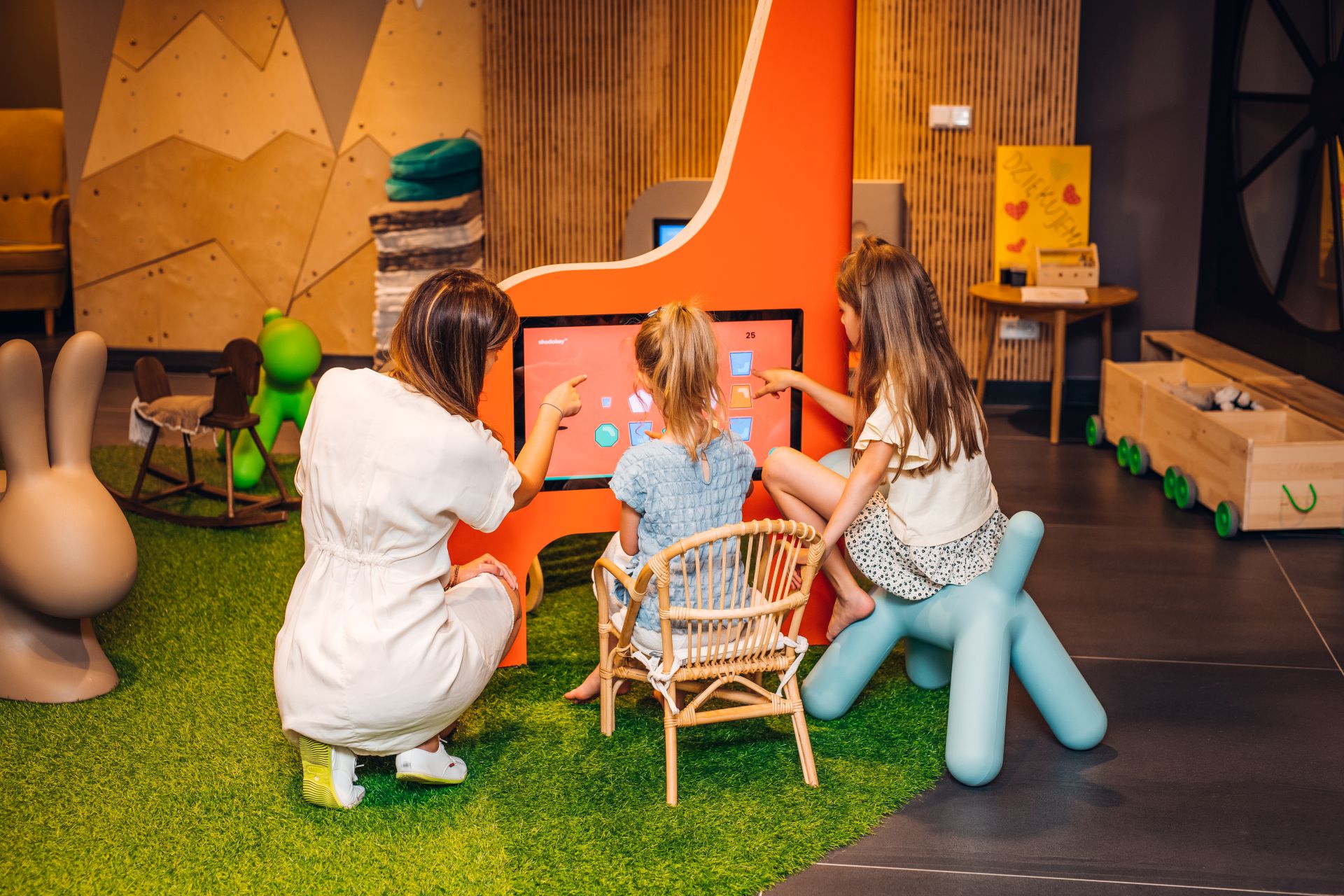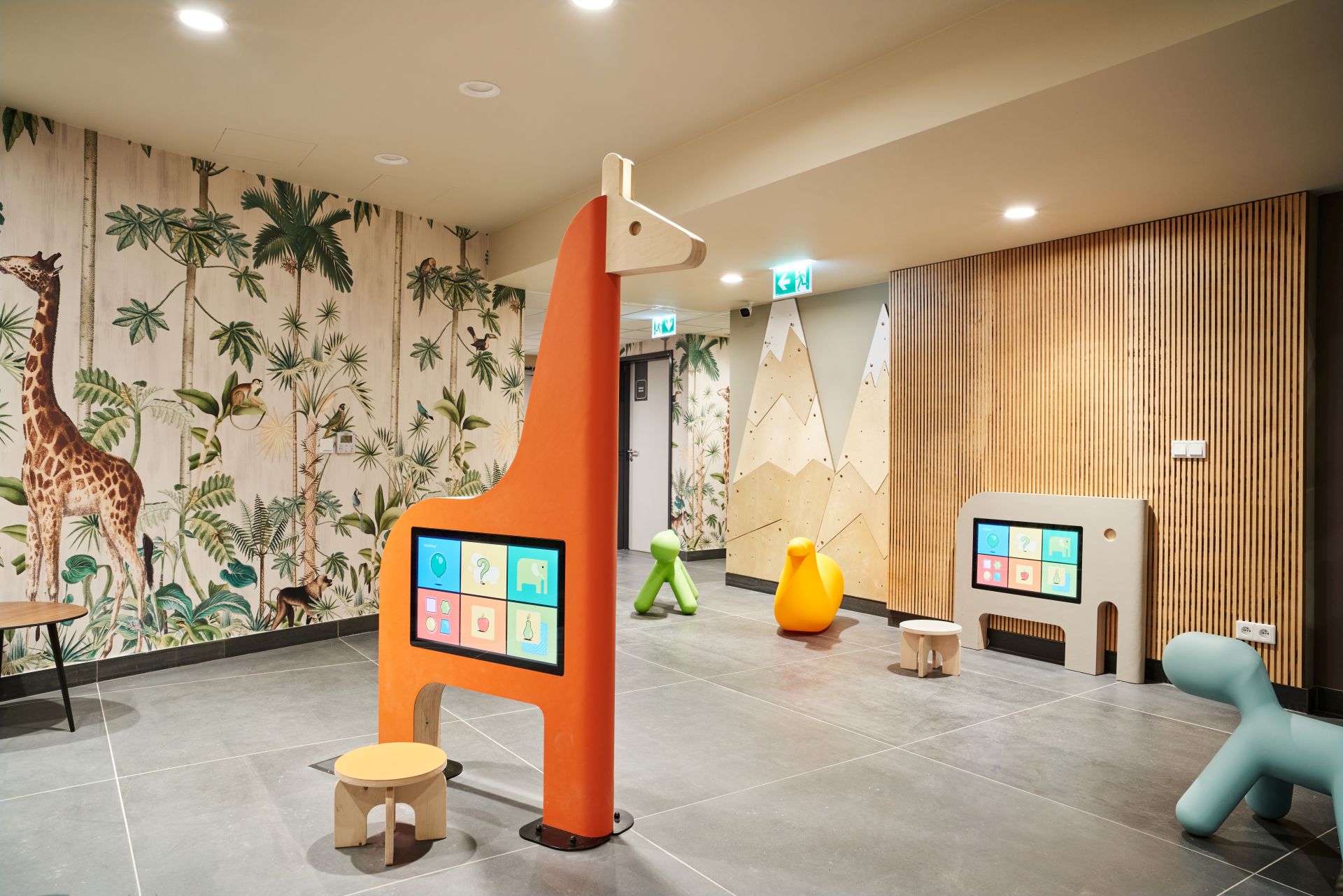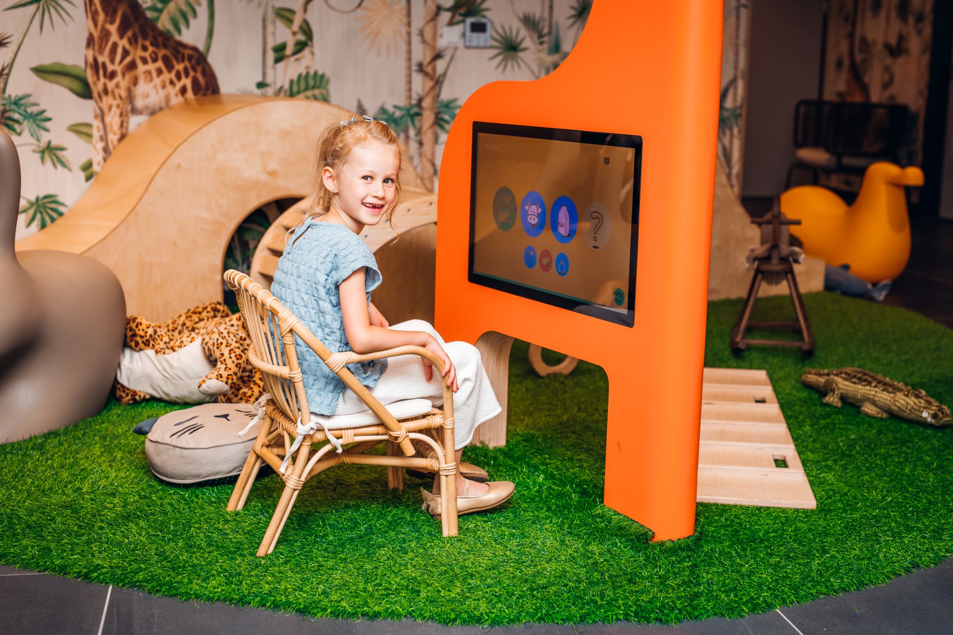 Pomagają w tym m.in. ekrany multimedialne w kształcie żyrafy i słonia. Na każdym z nich wgrano specjalnie zaprojektowane dla dzieci gry rozwijające wyobraźnię, koncentrację, logiczne myślenie, ale także precyzję. Gry spełniają także funkcję edukacyjną, są też ważnym „destresorem”, który skupia uwagę dziecka na angażującej jego myśli i ręce zabawie.
