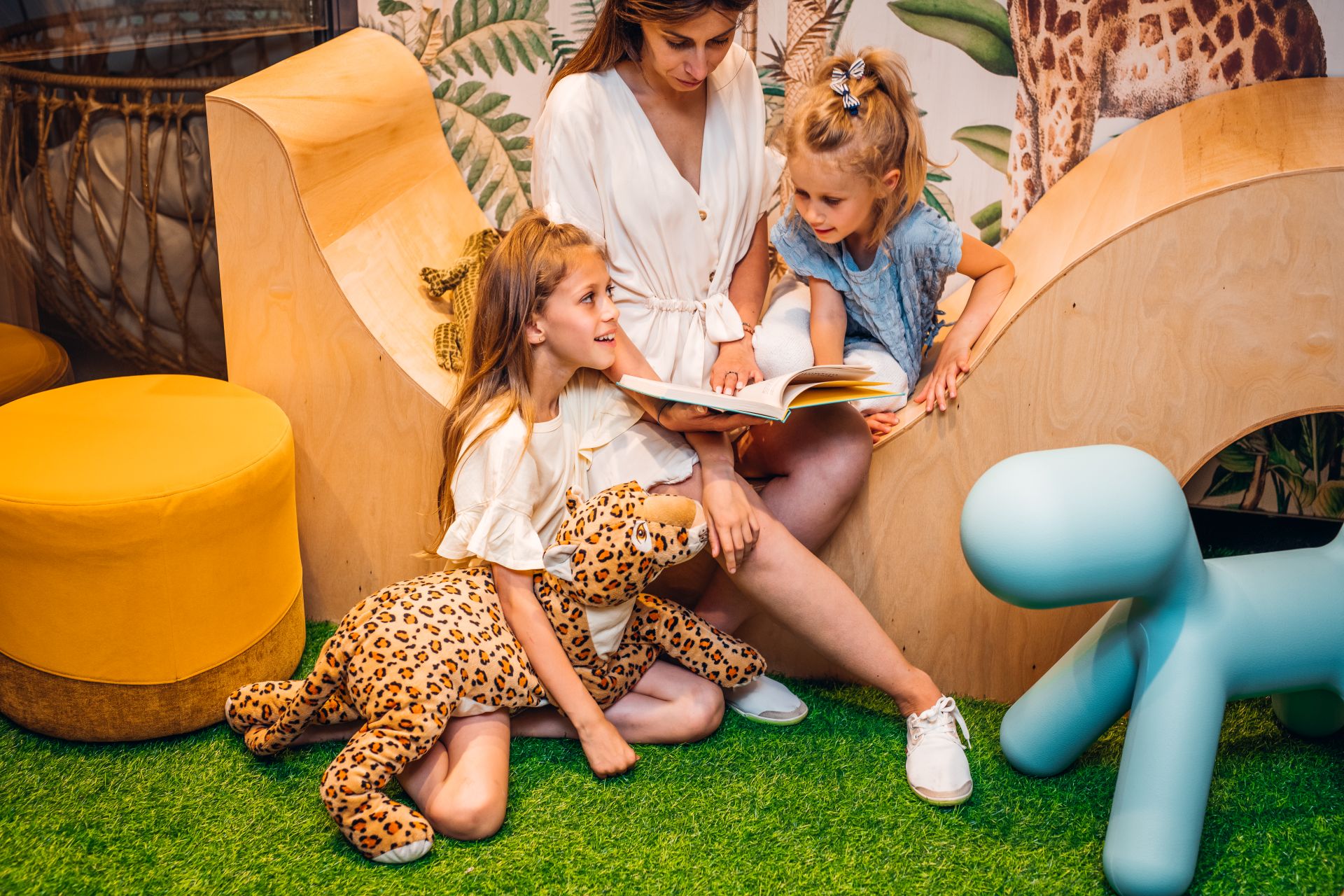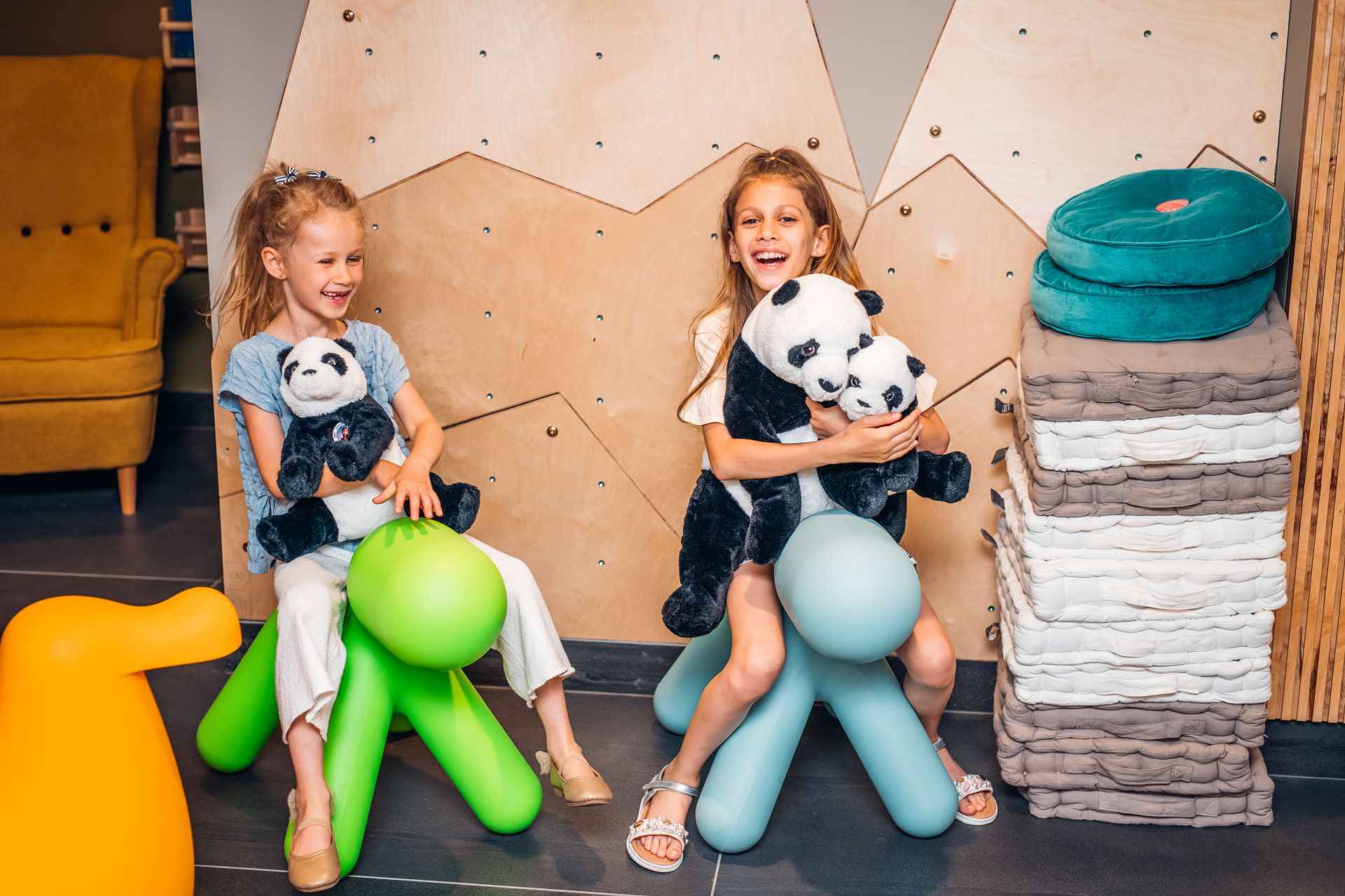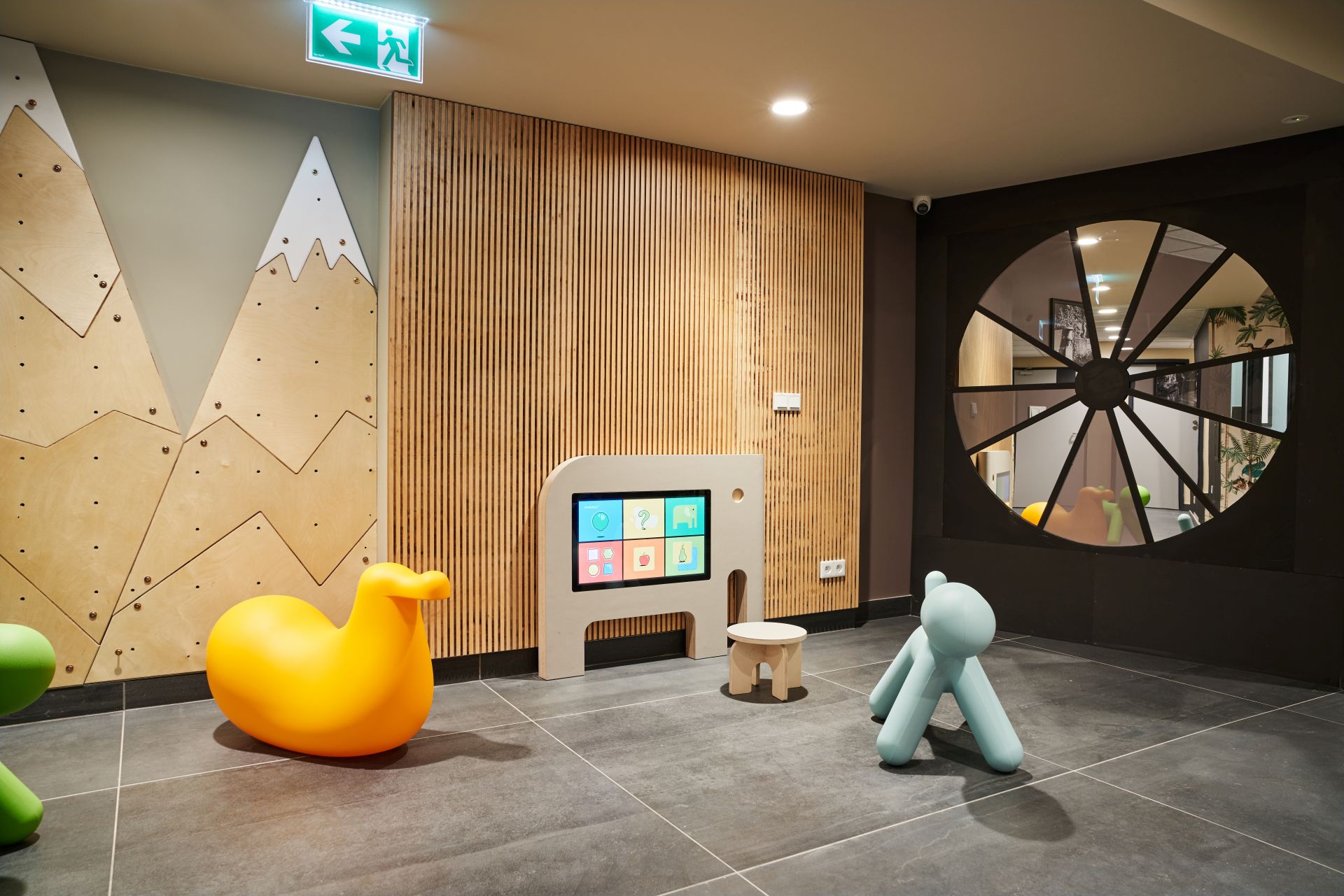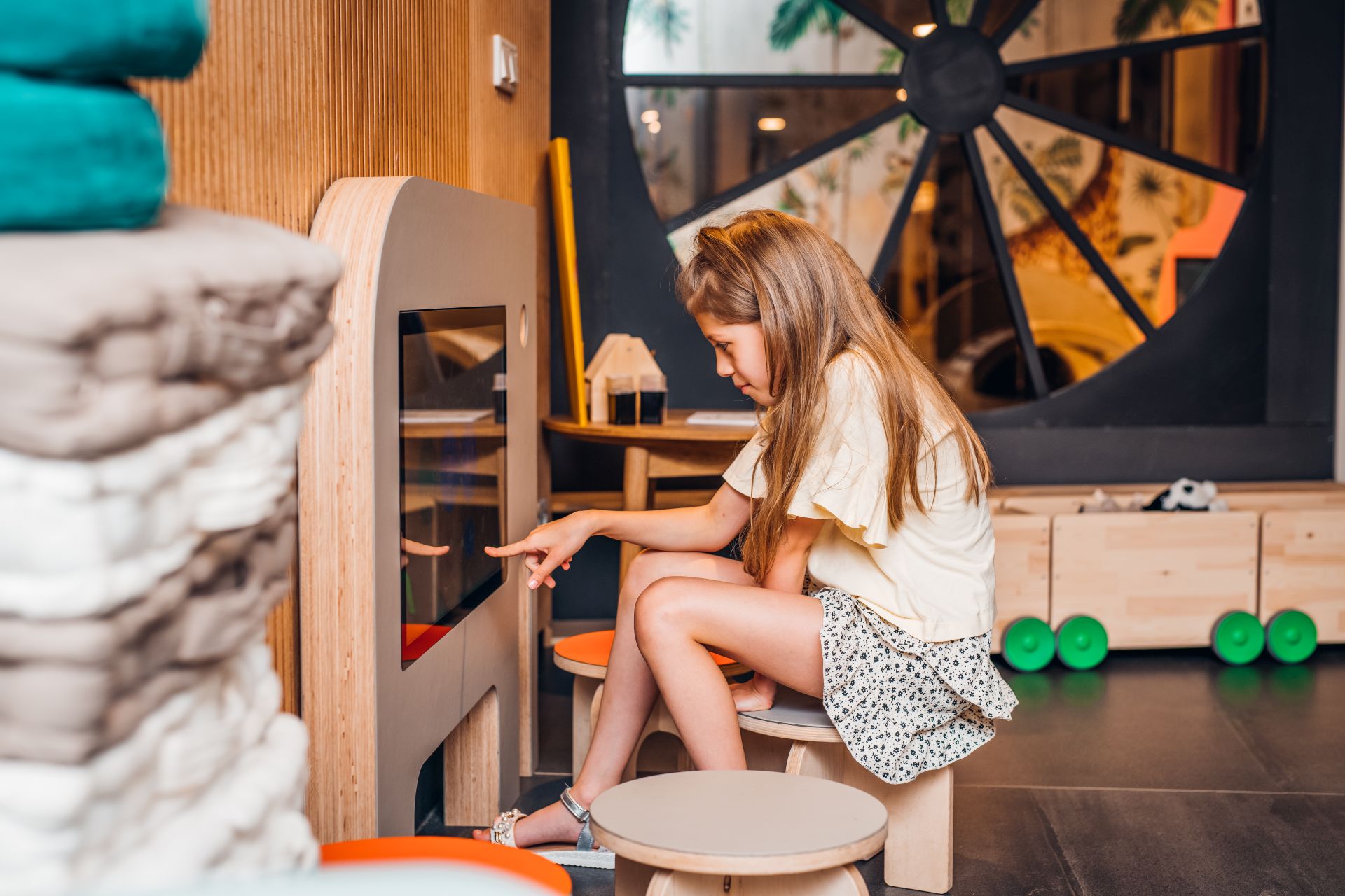 Pomagają w tym m.in. ekrany multimedialne w kształcie żyrafy i słonia. Na każdym z nich wgrano specjalnie zaprojektowane dla dzieci gry rozwijające wyobraźnię, koncentrację, logiczne myślenie, ale także precyzję. Gry spełniają także funkcję edukacyjną, są też ważnym „destresorem”, który skupia uwagę dziecka na angażującej jego myśli i ręce zabawie.
