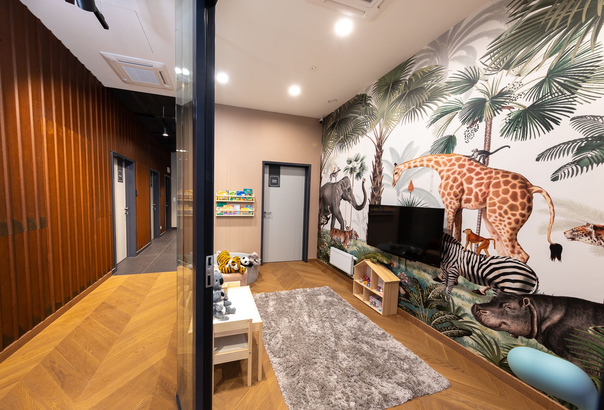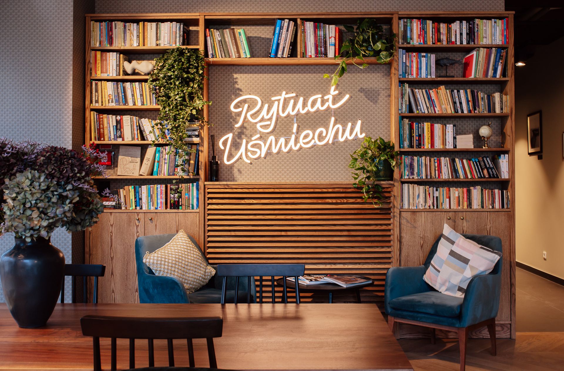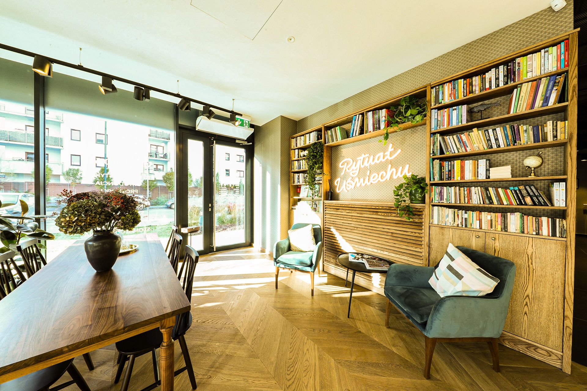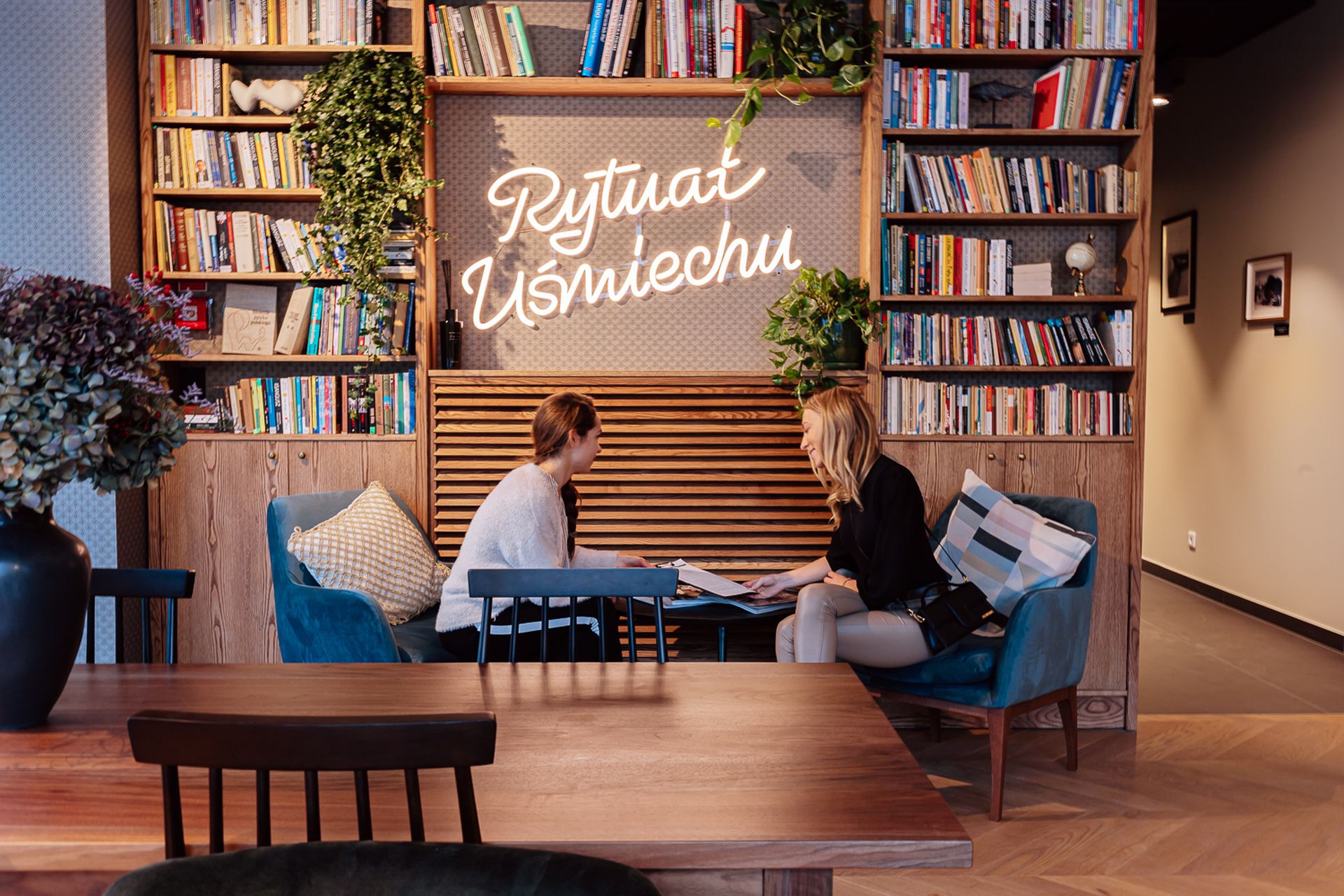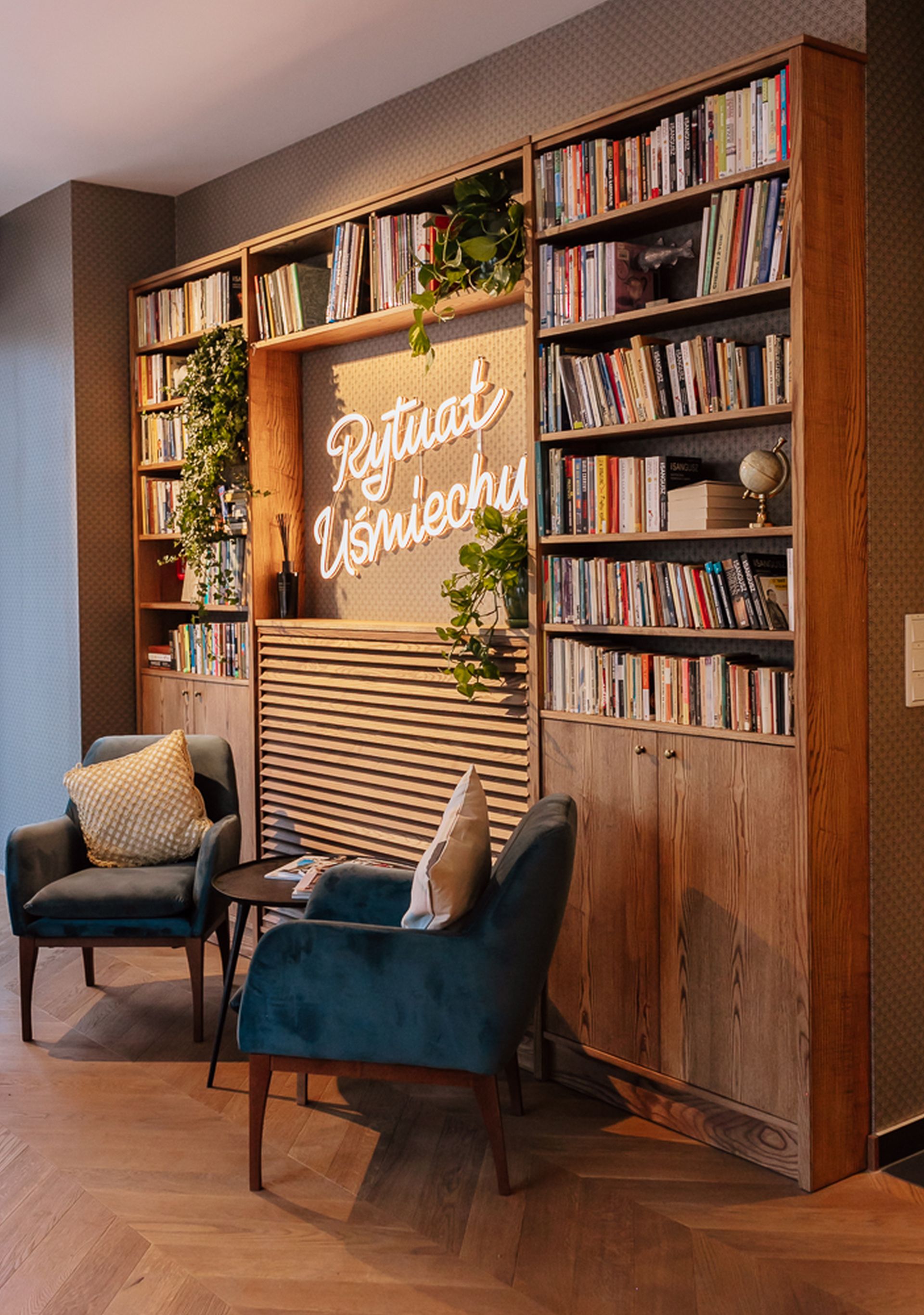 Poczekalnie zaaranżowano tu jak hotelową strefę lounge, którą wypełniono designerskimi fotelami i stolikami kawowymi, a także stanowiskiem self-service, gdzie można zaparzyć sobie kawę lub herbatę. Pojawia się tutaj też olbrzymia biblioteczka, w której znalazły się pozycje z kanonu światowej literatury, jak również albumy ze zdjęciami i popularne poradniki. Kolory i materiały wykończeniowe całej przestrzeni dobrano w taki sposób, aby te nie drażniły zmysłów, a koiły nerwy. Stąd obecność m.in. różnych odcieni drewna, czerni czy naturalnych kolorów i materiałów. Podobnie zresztą jest z barwą i natężeniem światła, zapachem, a nawet wyciszającą muzyką.