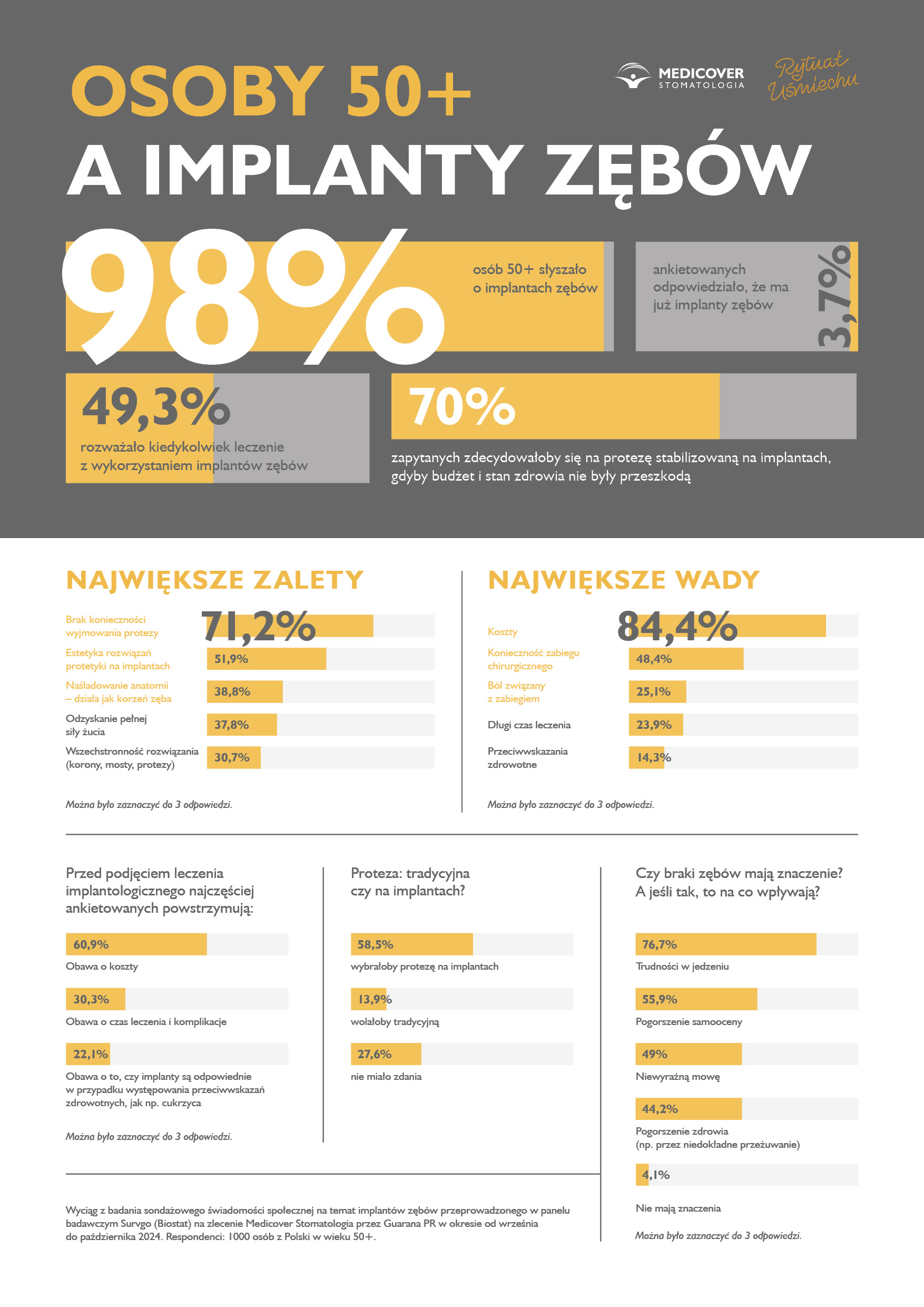 70,8% ankietowanych zdecydowałoby się na protezę na implantach, gdyby finanse i stan zdrowia nie były ograniczeniem. Na pytanie, co obecnie powstrzymuje ich przed wszczepieniem implantów, 22,1% odpowiedziało, że nie wie, czy ich stan zdrowia jest odpowiedni, a 10,3% stwierdziło, że wie o nich zbyt mało.